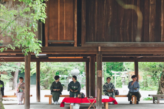 新緑の美しい初夏と紅葉が楽しめる秋に行われるこのお茶席は、参拝者向けに、かみさまとともにかつて境内にあった老舗菓子店「水田玉雲堂」の名物菓子「唐板」とお抹茶で一服していただく催しです。お参りのあとも心静かにお過ごしいただきたいと願い、戦前まで境内にあった茶店を再現しています。参拝者は、鳥のさえずりや境内の美しい新緑の中で、心づくしの一椀をいただきながら静かなひと時を過ごすことができます。