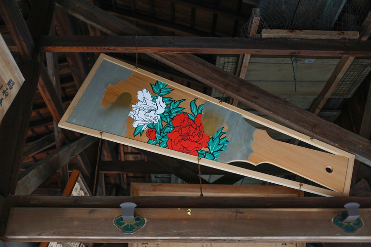 絵馬堂も宮中から下賜された木材で建立されています。頭上には氏子から奉納された絵馬や江戸時代の欅に書家吉川蕉仙氏の書を刻んだ額が掛かっています。