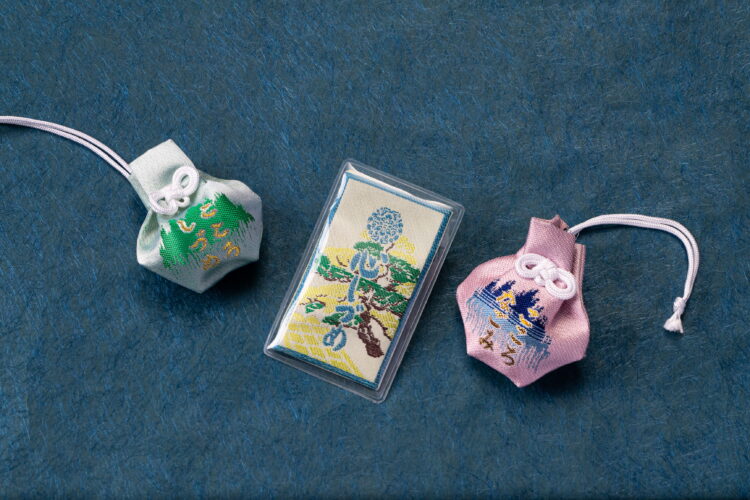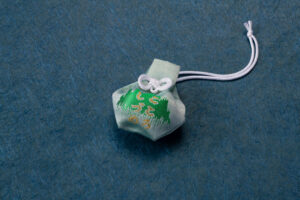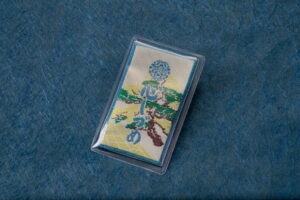 薄緑地に「こころしづめ」、ピンク地に「こころなごみ」とそれぞれ記した巾着型のほか、カード型の計3種類。不安やストレス、緊張、苛立ちなどをしずめるご利益があるとされます。手のひらサイズがかわいい巾着型は実際、手にしてみると弾力性があり、そのやわらかさに頬が思わず緩んでしまいます。初穂料はいずれも1000円。和装にも似合うデザインで、茶席に臨む時などにそっと着物に忍ばせておくと、緊張を解きほぐしてくれるかもしれません。茶の湯デジタルマップを見て参詣したことを伝えると、御朱印の際に添えられる紋菓が御守授与の際に添えられます。