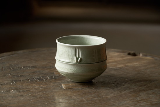 灰釉引出竹茶碗。焼成段階で窯から引き出し急冷させることでこの色を出しています。
