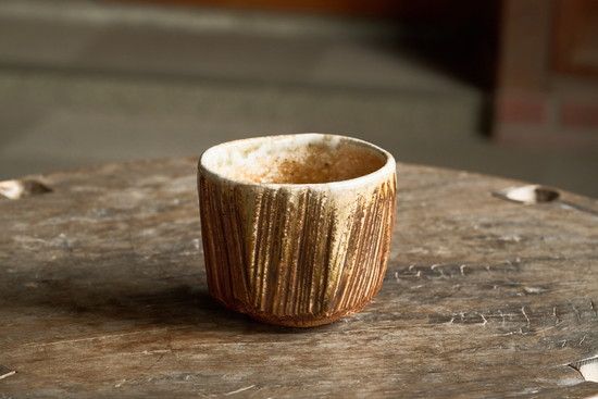 割木紋茶碗。土の塊を赤松の割木で打ち付けてから、茶碗の形にくり抜いています。