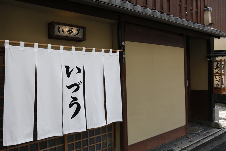 祇園切り通しに佇み、白生地に「いづう」の文字が筆書きされたシンプルなのれんが目印。創業時から同じ場所で商いを続けています。建物も基本の構造は変わっていない。