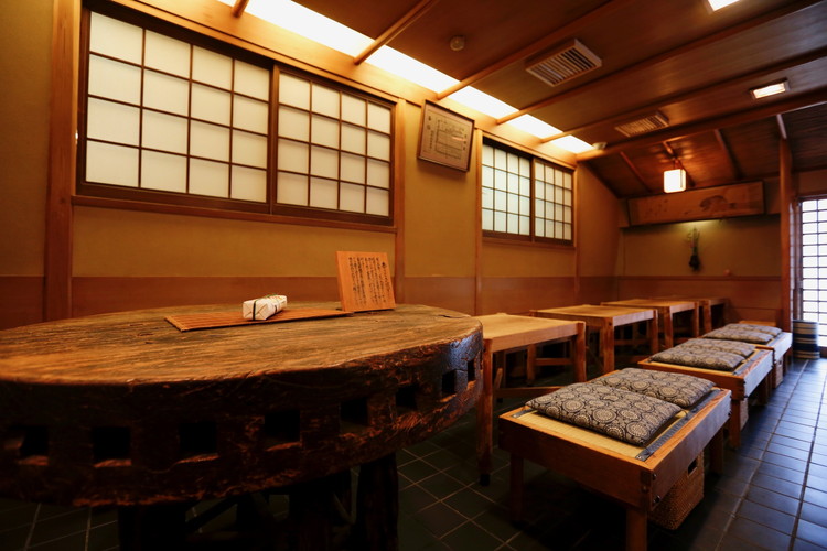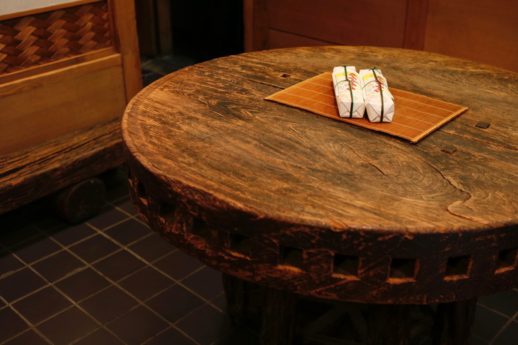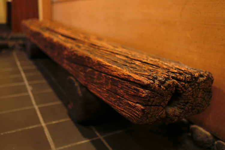 店内でひときわ存在感をしめすテーブルは水車の軸に使われていた古材。『水にまつわるもの=沈まない」ことから、商売繁盛を願った縁起担ぎで。沓脱にも舟の舳先だったものを設置。