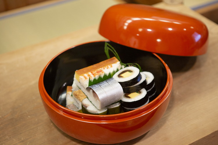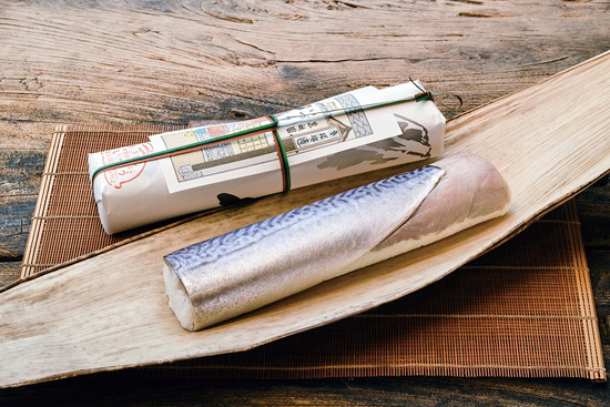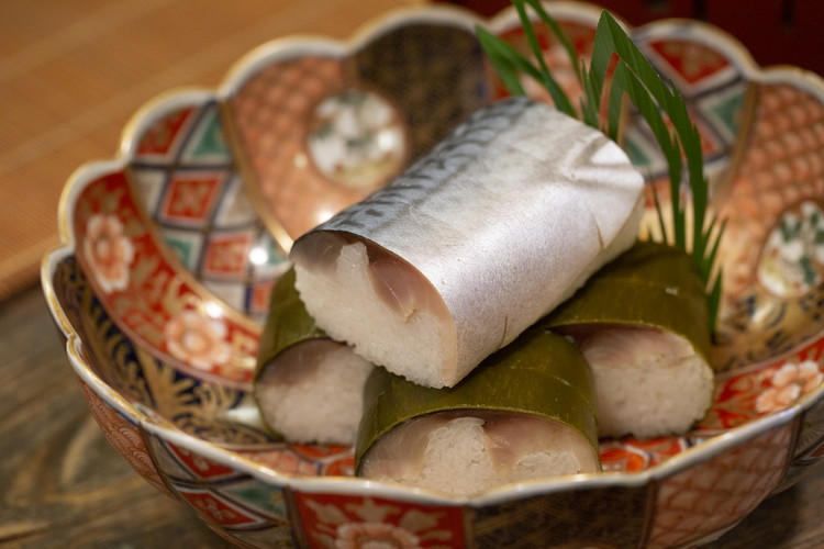 「ハレの日の食べ物」で「ご進物」としても重宝される鯖姿寿司。祇園のお座敷では、色鮮やかな古伊万里の器などに盛りつけます。