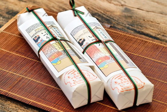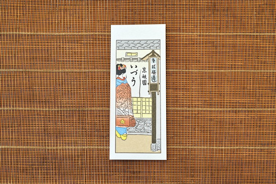 手彫りの木版画ならではの趣がある掛け紙もオンラインショップ「いづう好み」の特別なものに。お店の外観と舞妓の後ろ姿で構成したデザインに、「いつの日か、また京都祇園へ、そしてお店へお越しください。」というメッセージを込めました。発送では味わうことのできない出来たてのお味はぜひお店で。