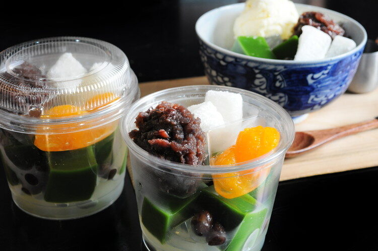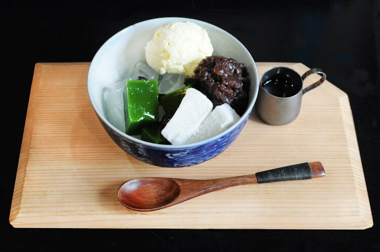 やわらかい求肥は食感もよく添加物未使用のあんみつのほどよい甘さが涼感とともに広がります。寒天の抹茶には味が濃く香りの良いものを厳選。塩味の利いた赤えんどう豆が甘さを一層引き立たせるアクセントになっています。
