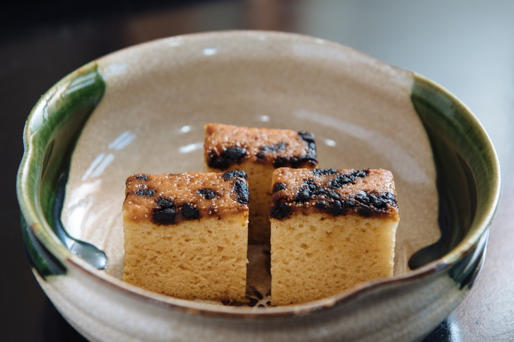 卵の代わりに白味噌を使ったカステラの一種。甘い白味噌の味と大徳寺納豆の塩辛さがバランス良く、茶会でもよく好まれています。「京松風」1,000円(税別)。