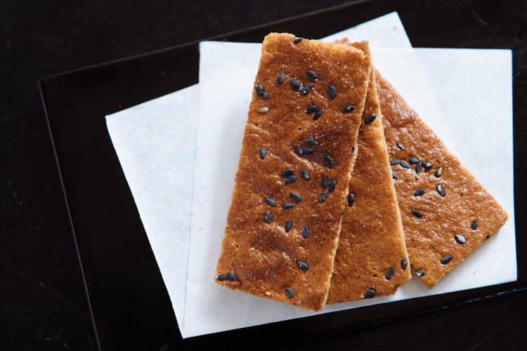 大徳寺納豆を生地に練り込んで焼き上げた煎餅で、ゴマを振りかけて香ばしく仕上げています。