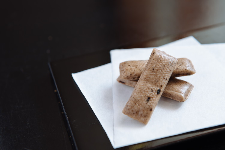 大徳寺にほど近い千本北大路に佇む紫竹庵。京都市北区の紫竹牛若町にあった納豆の老舗・紫竹納豆が前身で、百貨店への出店を機に、大徳寺納豆を使った和菓子の店として平成10年(1998)に創業しました。大徳寺納豆は、普通の糸を引く納豆とは別のもので、唐の時代の中国から製法が伝わり、室町時代には大徳寺門前で作られてきました。大徳寺の他にも禅寺で多く作られたことで「寺納豆」とも呼ばれ、ある意味こちらが納豆の元祖とも言われています。その独特の香りとクセを愛する人も多く、塩みの中にコクやうま味がある濃厚な風味が特徴です。昔からお茶請けや酒の肴としても好まれ、料理の調味料としても用いられてきました。またお菓子に少量加えることで甘さを引き出すアクセントにもなることから和菓子の材料にも使われ、「有平糖」や「松風」などは茶席でもお馴染みです。紫竹庵の大徳寺納豆の商品には、お菓子以外のものもあり、ごはんや普段の食卓の一品を美味しくひきたてるふりかけ「まぶし昆布」は代表の森口さんのアイデアで生まれた商品。大豆の発酵食品である大徳寺納豆は、植物性たんぱく質が豊富で、ヘルシーで美容にも効果的。そうした魅力を発信し、新たな大徳寺納豆の在り方も追求しています。