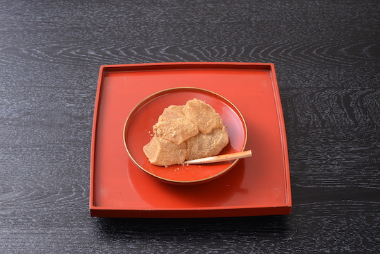 上にのせた大徳寺納豆の塩味がアクセントになります。形が雲水の笠に似ていることが名前の由来で、紫竹庵を代表する銘菓。