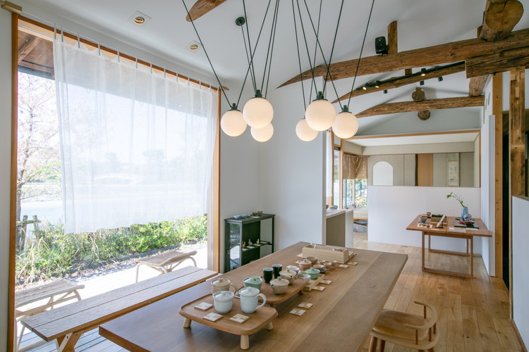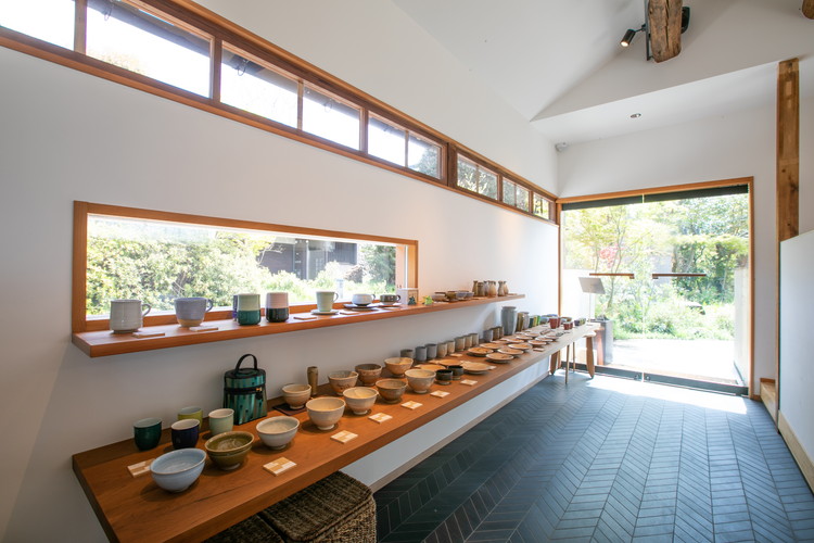 入ってすぐのショップスペースには、朝日窯工房による多彩な作品が並びます。その左手にはダイニングテーブルを置いたイベントスペースがあり、中央がギャラリー、その奥が茶室になっています。ガラス越しに遊歩道の自然と宇治川を望む、清々しく洗練された空間です。