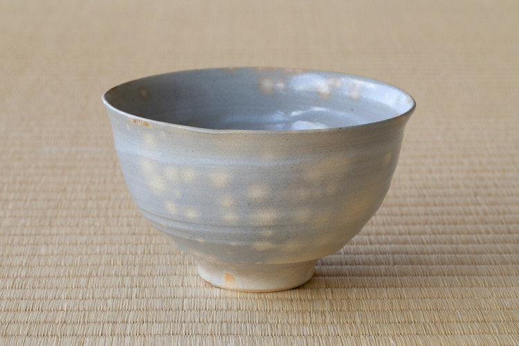 十六世豊斎作「鹿背茶盌」。窯変から生まれる独特の斑点は「鹿背(かせ)」と呼ばれ、朝日焼に受け継がれる特徴のひとつとなっています。このほか、鉄分が多く赤っぽい色が出たものは「紅鹿背(べにかせ)」と呼ばれます。
