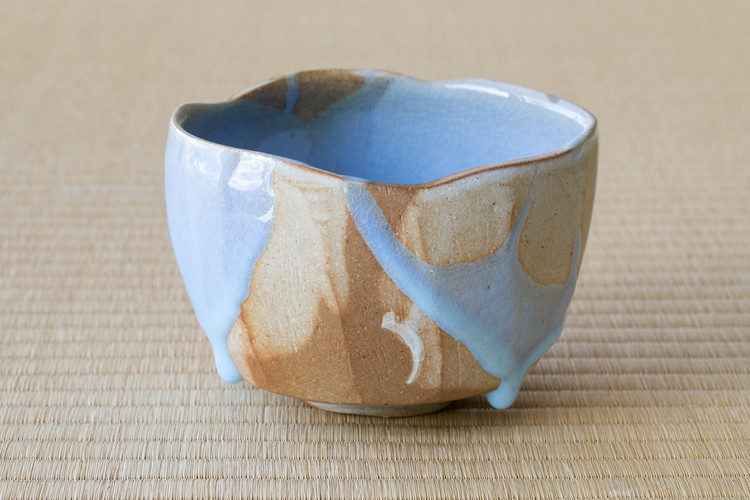 十六世豊斎作「月白釉流シ茶盌」。月白釉の鮮やかで惹き込まれるような水色が印象的な、当代を代表する作風。朝日焼伝統の宇治の土が松割り木の焼成によって見せる表情とともに、魅力的な色合いをつくります。まさに当代としての「綺麗寂び」の茶盌です。