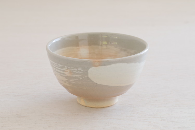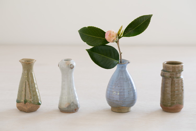 朝日窯作のうつわたち。宇治の土味が活きるベージュからグレーの地が特徴の「燔師(はんし)」の茶盌は、刷毛目のシンプルな意匠が特徴。一輪挿しは、多彩な造形に創意があふれます。
