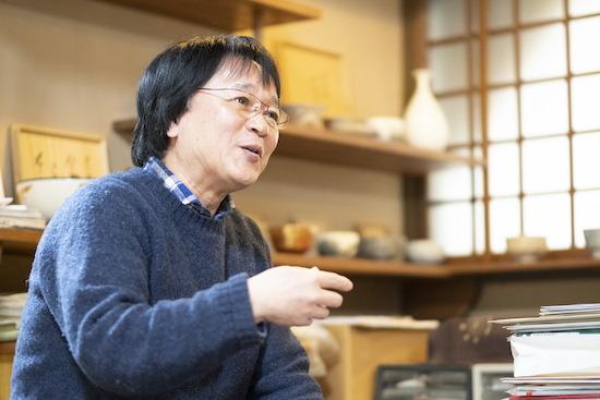 大正初期まで四代続いた古曽部焼は一端は途絶えますが、それを和歌山県の窯元の家に生まれた寒川義崇さんが縁あって継承。日用雑器ではなく、茶陶の古曽部焼を40年以上にわたってつくり続けています。「再興するにあたって大切にしたのは古曽部焼の匂い」と寒川さんは話します。「古曽部焼は高麗、安南、色絵付と、交趾以外は何でも焼いてきましたが、どれもあまり澄ましていない。ほっとするような匂いがある。そこを継承していきたいですね」。何でもあるのが古曽部焼の特徴と語る通り、工房にはひとりの作家が焼いたとは思えないほど多岐に富んだ茶陶が並んでいます。