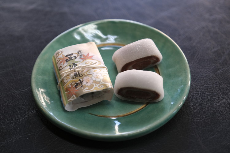 初代が考案した代表銘菓「西陣風味」。白生地に見立てた羽二重餅でこし餡をくるりと巻き、西陣織の反物に見立てています。たとう紙でくるみきりっと結んだ包みにも西陣の風情が。