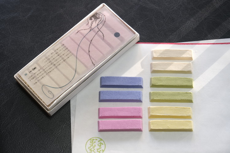 京都でオリジナル文具も手がけるグラフィックデザイナーとのコラボレーションから生まれたモダンな干菓子「日月菓」(にちげっか)。その色とパッケージは、京都の東西南北を司る「四神」にちなんでいます。