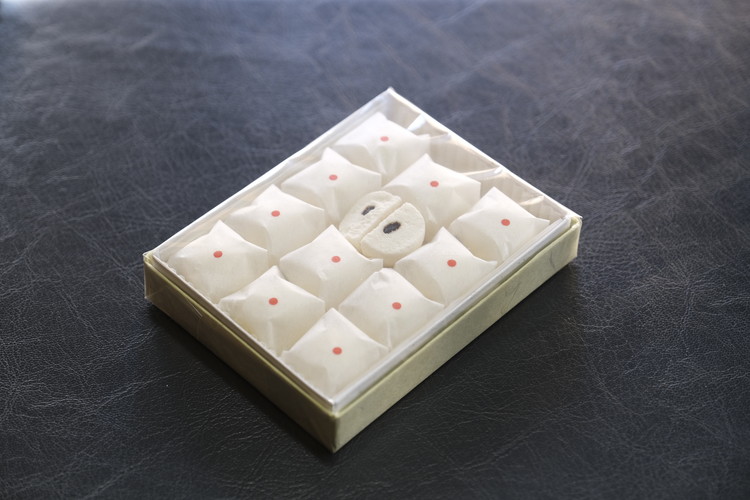 中に大徳寺納豆の入った白い落雁「大内山 笑顔」。「大内山」は御所を表す雅語。平安絵巻に描かれたふくよかな笑顔を表現しています。シンプルながらも、やさしい気持ちになれるお菓子です。