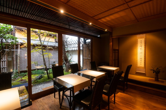 呉服商が営まれた頃の趣を留めつつ、ゆっくりとお茶を楽しむ時間を過ごすために意匠へのこだわりが各所に。テーブル席は10席だけですが、ゆったりと配しています。もとの建物に手をいれ茶房をつくる際も床の間はそのままの姿で残しました