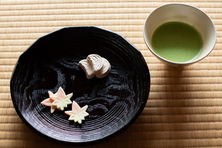 干菓子は市内の菓子店「利久庵」の稲穂とうすもみじ。器は先代村瀬治兵衛の作。備え付けの貸出茶道具は一点前分を基準としており、本館閲覧室にある所蔵品リストから選べます。