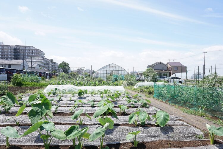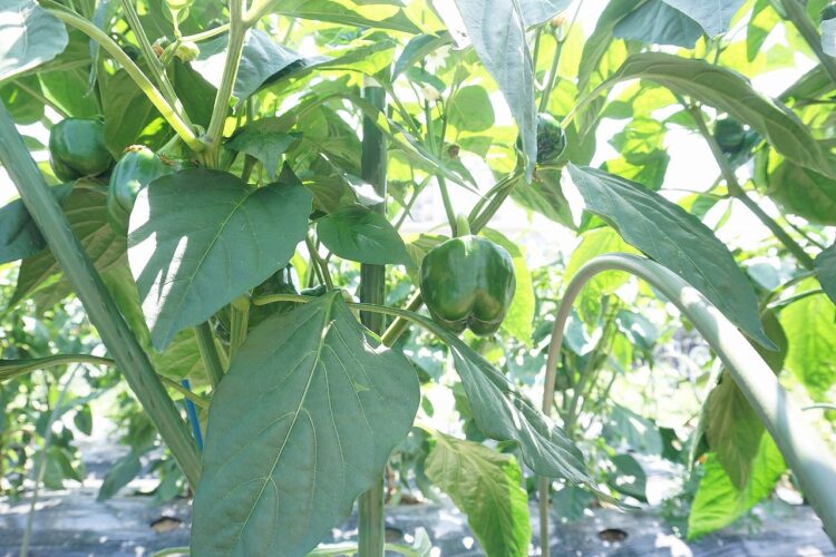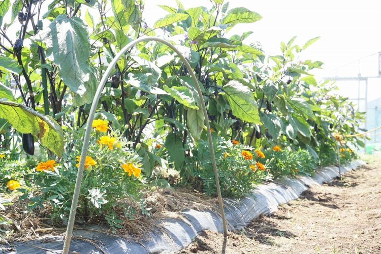 肉厚で甘いジャンボピーマン(上)やナス(下)など、くらま農園の野菜は元気いっぱい。ナスの根元に植えたマリーゴールドは、線虫の繁殖を抑えるコンパニオンプランツです。また、たとえばピーマンでもトマトでも1品種だけでなく複数の品種を育てており、年間およそ50品目・200品種の野菜を収穫しています。