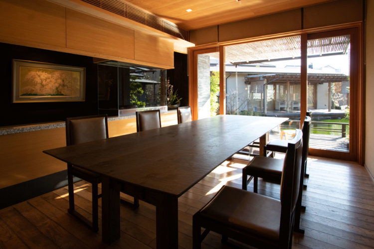 個室はすべて錦鯉が泳ぐ大きな池に面しています。店の建設にあたって井戸を掘り、湧水を導きました。春は桜、初夏は金明竹や蓮などを池の中央に設えた、季節を感じられる演出が素敵です。