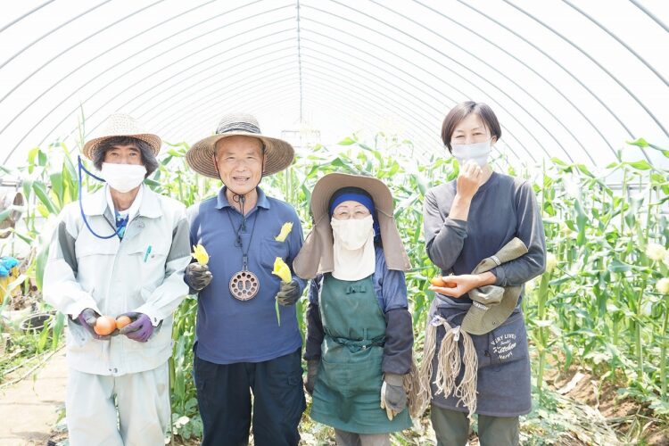愛情をこめて野菜を育てている農園スタッフの松田さん、木村さん、丸山さん、迫さん(左から順に)。「野菜、おいしかったよ、きれいだったよと料理長から言われると、うれしいですね」