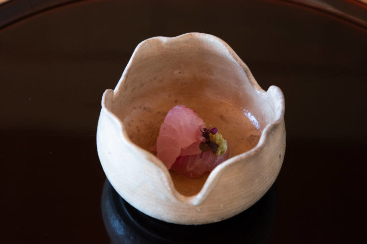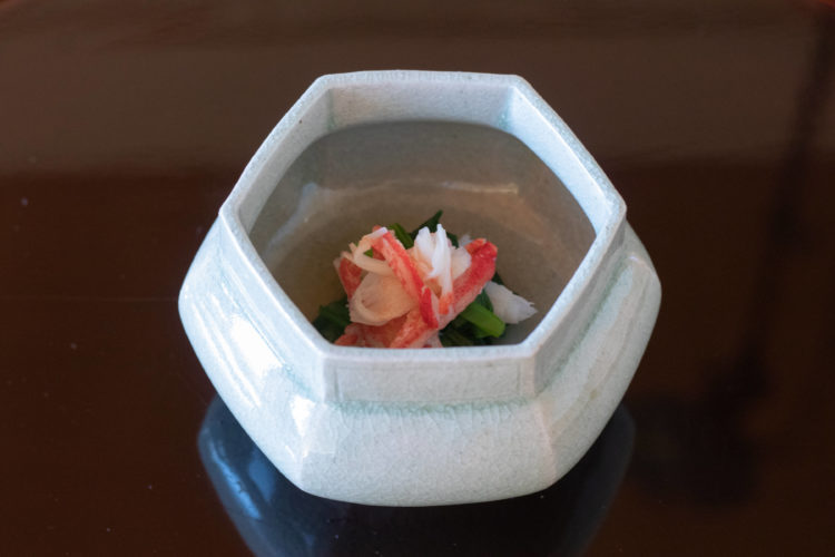こだわりの器も楽しみな春の懐石料理から3品。上から御深井焼(おふけやき)に盛りつけたかにと小松菜のおひたし、桜花を散らした椀によそった蛤真薯・たけのこ・こごみの吸物。いさきのお造りは白楽焼の割山椒で。やわらかい肌が魚の身の色を引き立てます。