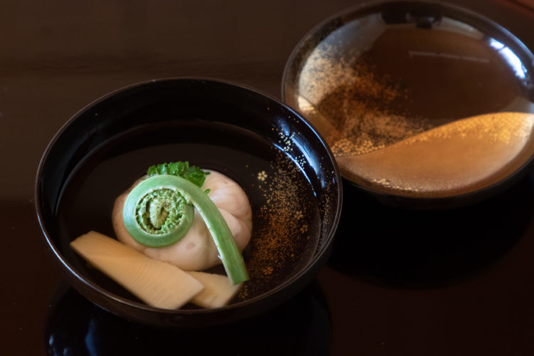 「ひな祭り茶事」の料理から3品。写真上から向附の鯛昆布〆、ちらし寿司(錦糸、海老、穴子、蓮根、百合根、こごみ、木の芽)、白味噌仕立ての汁(蓬麩、水前寺海苔、溶きからし)。
