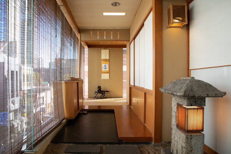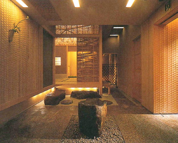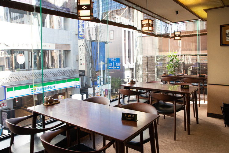 6代目当主の加藤正さんは平成9年(1997)に、それまでテナントが入っていた地階を改装して「茶室 山庵」を開きました。裏千家東京道場のある市谷加賀町は神楽坂に近いことから出前などを通じてお付き合いがあり、加藤さん自身も若いころからお茶に親しんできたご縁から思い立ったそうです。設計は高山不二夫デザイン研究所に依頼し、水澤工務店が施工しました。二畳台目、八畳、十畳と趣の異なる3つの茶室がほどよい間合いで配置され、地階であることを忘れさせる落ち着きと居心地のよさは、さすが老舗と思わせます。定例のお茶事教室、月4回の茶道教室、また毎月第1土曜に開かれる施茶釜などで賑わっています。