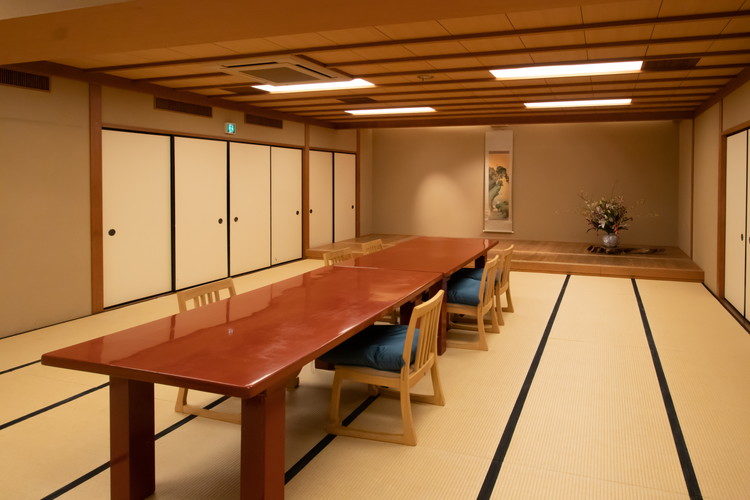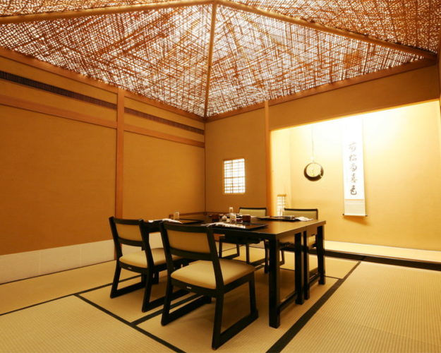 3室ある茶室はそれぞれ趣が異なり、お茶事はもちろん会食や接待の場としても利用できます(2名〜8名)。上の写真2点は八畳の「海月亭」。天井に竹の乱れ編みをしつらえた草庵風で、やわらかい照明が落ち着けます。