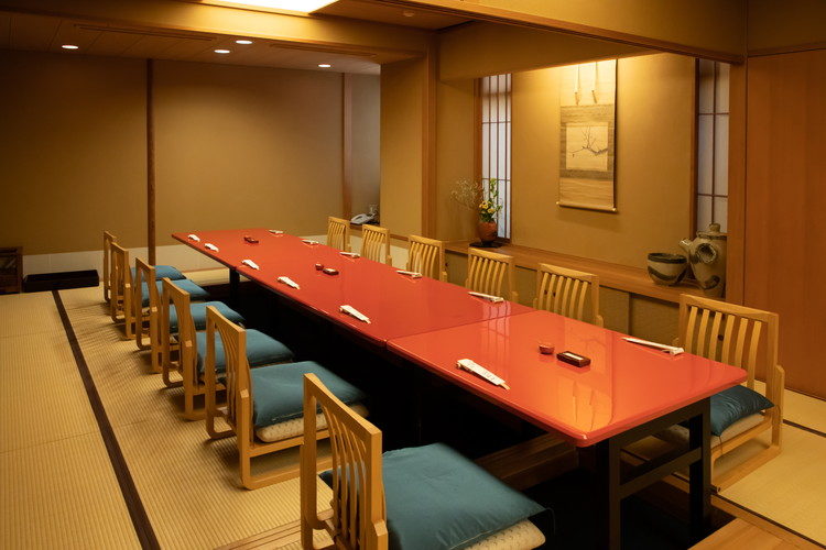 賑やかな神楽坂に面した、総ガラス張りの窓が明るい2階テーブル席(上)。2階奥には小人数の会食や親族の集まりなどに格好の、掘りごたつ式の座敷があります(下)。